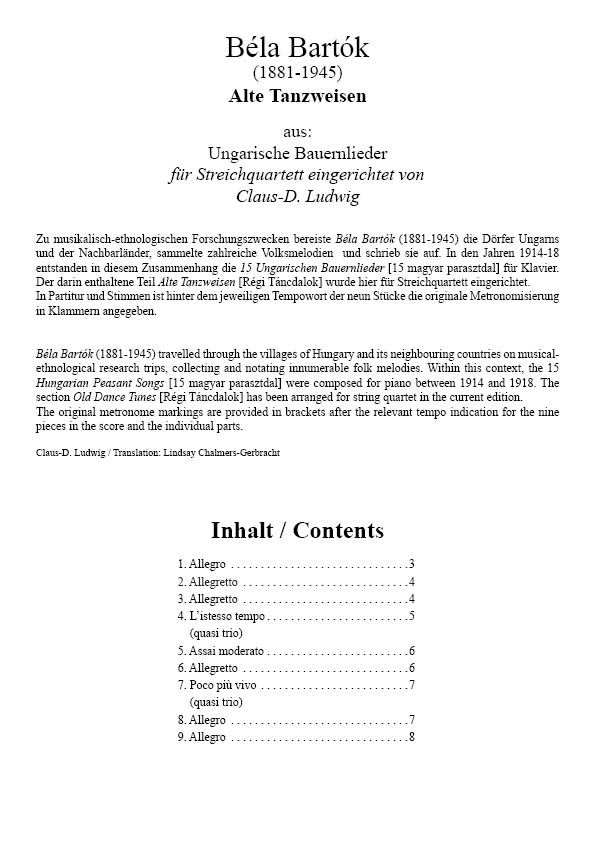 Zu musikalisch-ethnologischen Forschungszwecken bereiste Béla Bartók (1881-1945) die Dörfer Ungarns und der Nachbarländer, sammelte zahlreiche Volksmelodien und schrieb sie auf. In den Jahren 1914-18 entstanden in diesem Zusammenhang die 15 Ungarischen Bauernlieder [15 magyar parasztdal] für Klavier. Der darin enthaltene Teil Alte Tanzweisen [Régi Táncdalok] wurde hier für Streichquartett eingerichtet. In Partitur und Stimmen ist hinter dem jeweiligen Tempowort der neun Stücke die originale Metronomisierung in Klammern angegeben.