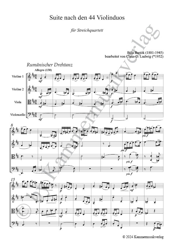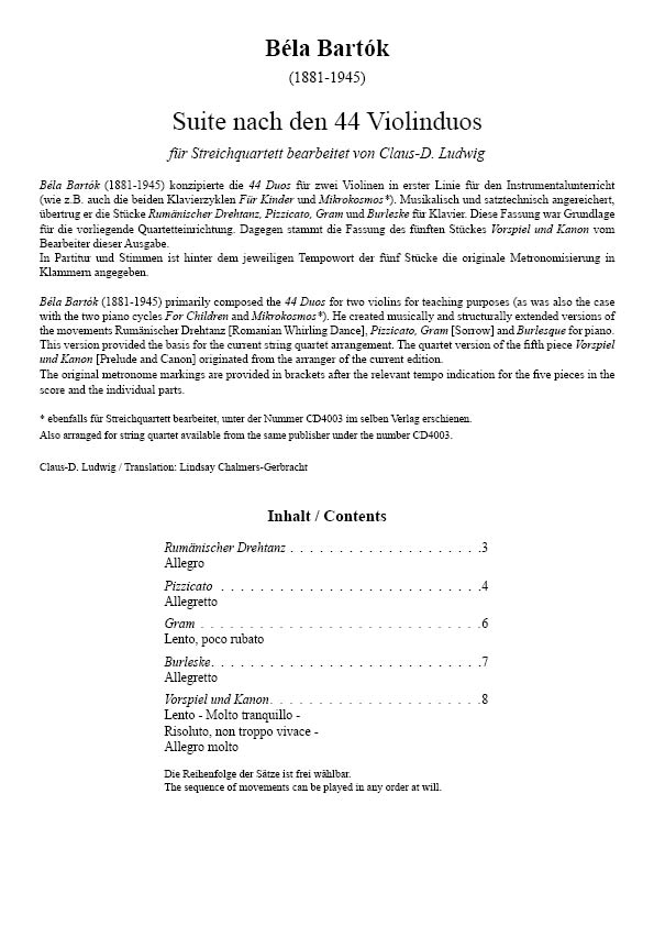 Béla Bartók (1881-1945) konzipierte die 44 Duos für zwei Violinen in erster Linie für den Instrumentalunterricht (wie z.B. auch die beiden Klavierzyklen Für Kinder und Mikrokosmos*). Musikalisch und satztechnisch angereichert, übertrug er die Stücke Rumänischer Drehtanz, Pizzicato, Gram und Burleske für Klavier. Diese Fassung war Grundlage für die vorliegende Quartetteinrichtung. Dagegen stammt die Fassung des fünften Stückes Vorspiel und Kanon vom Bearbeiter dieser Ausgabe. In Partitur und Stimmen ist hinter dem jeweiligen Tempowort der fünf Stücke die originale Metronomisierung in Klammern angegeben.