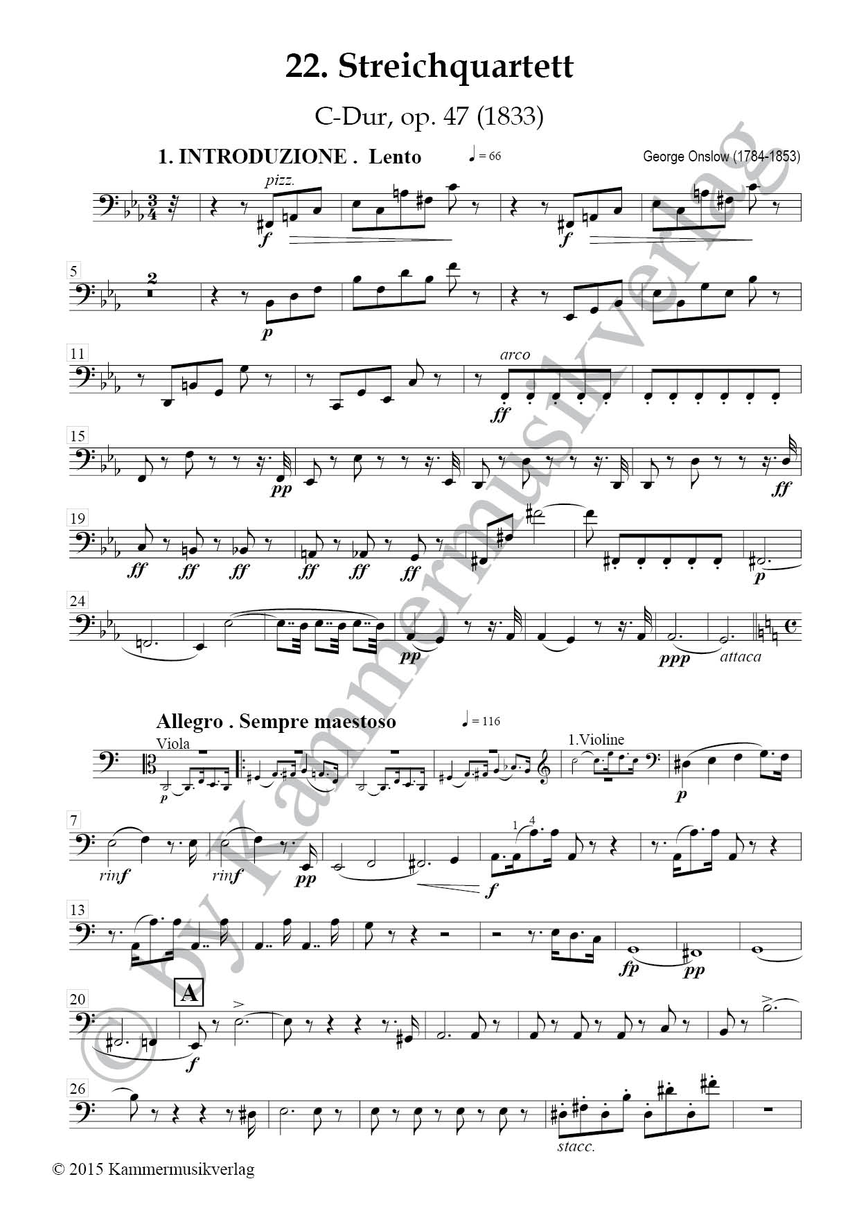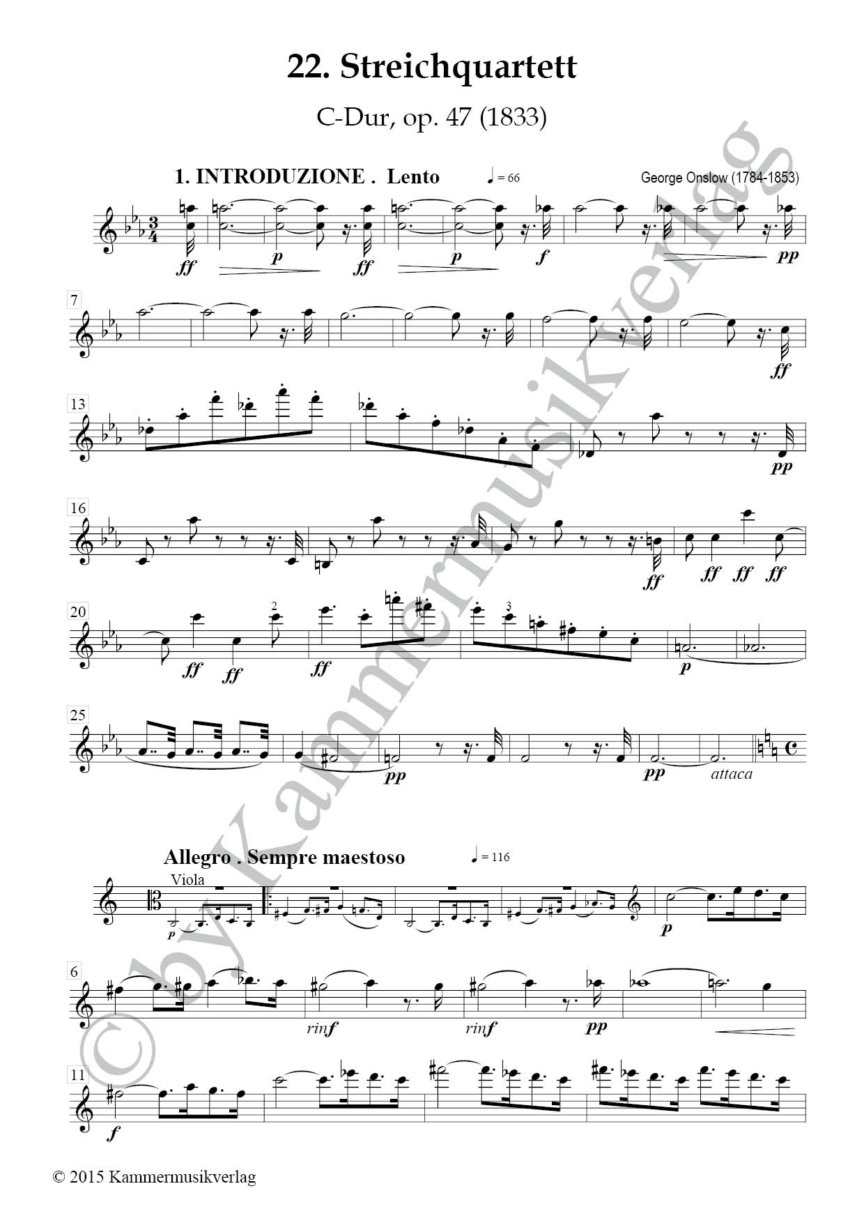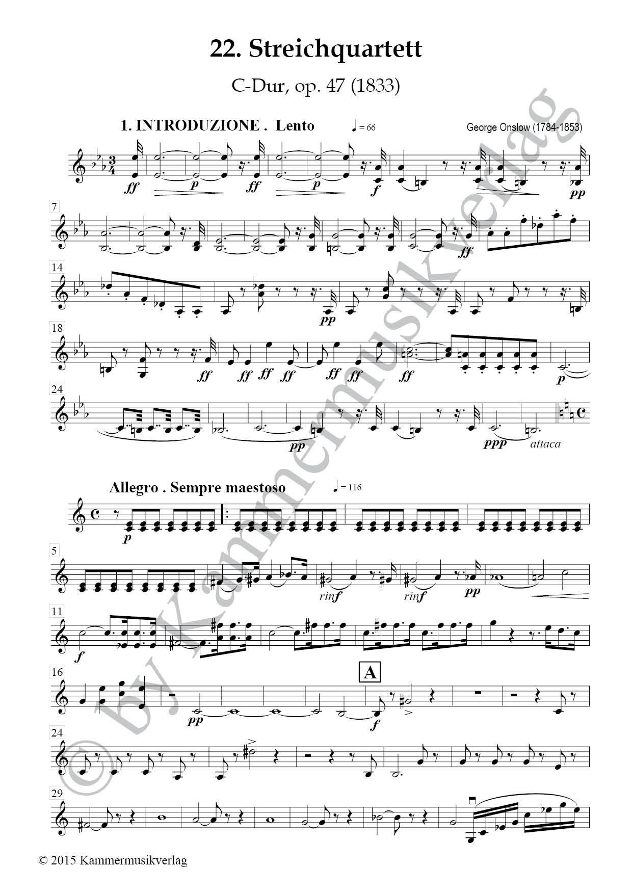 Praktische Neuausgabe nach der Erstausgabe: «Quatuor N° 22 pour deux Violons, Alto & Basse, composé et dedié à Monsieur Maximilien d´Autrive par George Onslow » Leipzig, chez Fr. Kistner / Paris, chez E. Troupenas, VN 1026, [c1834]