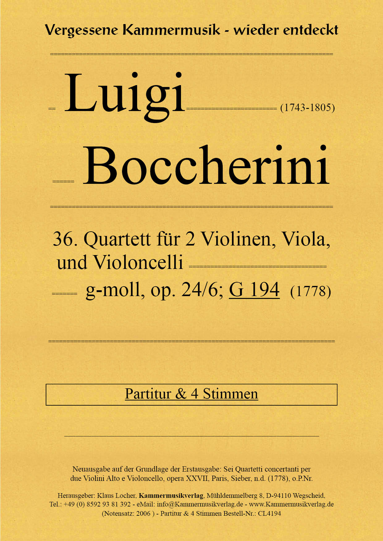 Boccherini, Luigi - 36th Quartet for 2 Violins, Viola and Violoncello, G Minor, op. 24-6, G 194