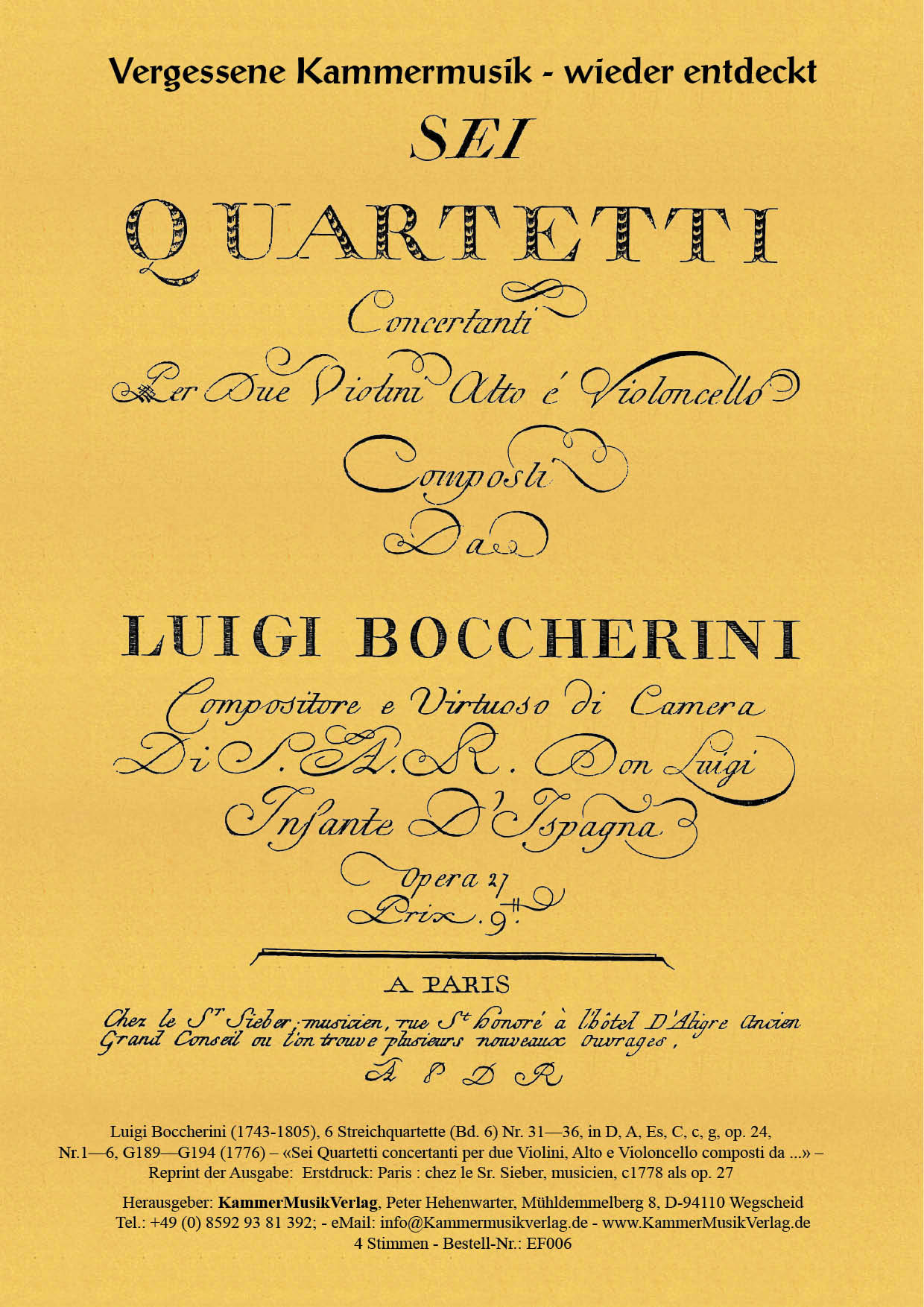 6 Streichquartette (Bd. 6) Nr. 31—36, in D, A, Es, C, c, g, op. 24, Nr.1—6, G189—G194 (1776) –